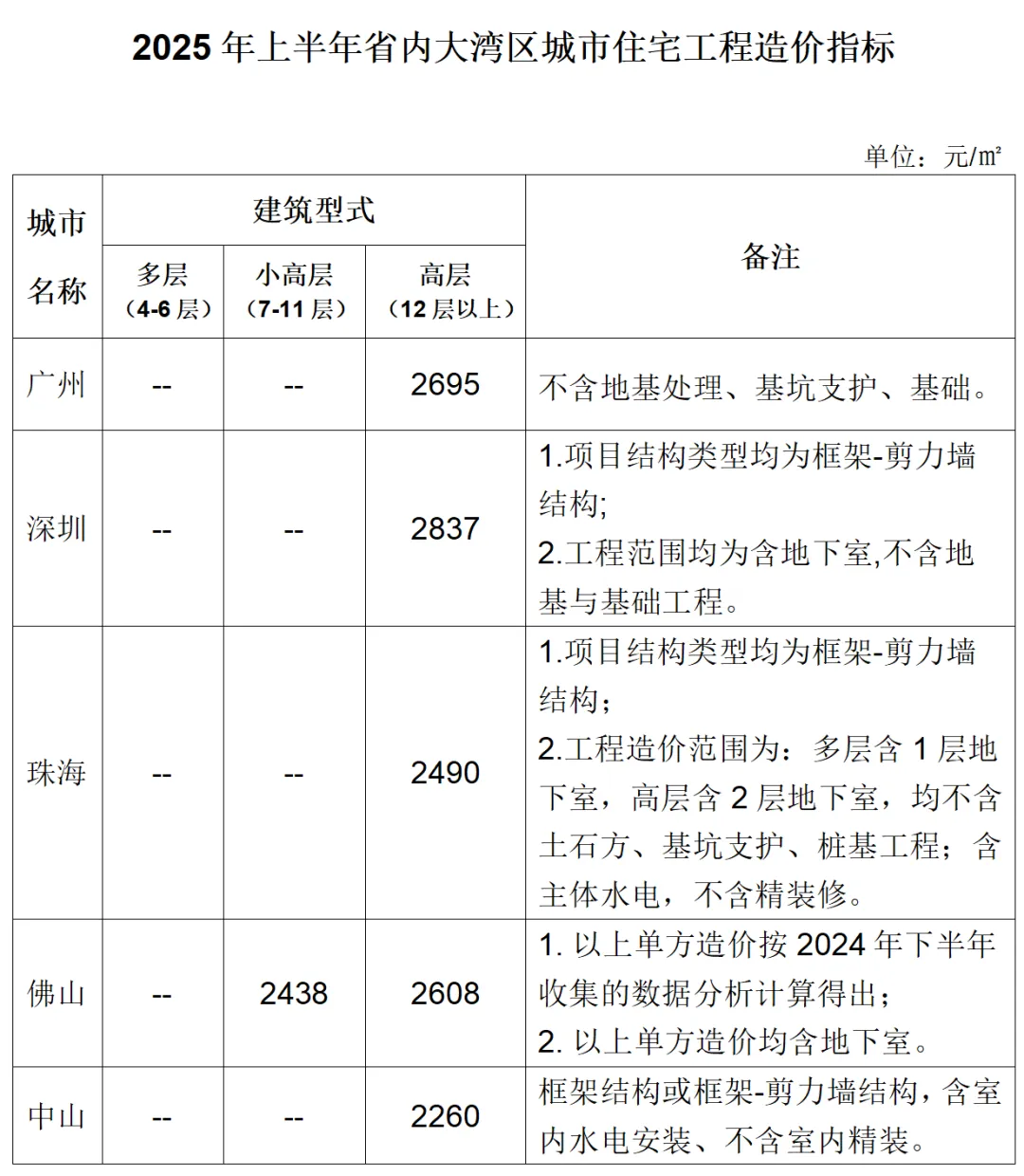 公司公告: 广东省建设工程造价咨询服务收费标准表 广州市财经职业学校太和校区培训大楼工程咨询服务招标公告0 广州市财经职业学校太和校区培训大楼工程咨询服务招标公告3 三水西铁路货场路面沥青改造工程施工招标公告 您的位置: 首页 > 企业新闻 【转发】关于发布广东省内大湾区城市2025年上半年 住宅工程造价指标信息的函 作者:广东吉光 2025-07-15 各有关单位: 为加强省内大湾区城市住宅建造成本监测,推动各地市已完住宅工程造价信息数据库建设,现将省内大湾区城市2025年上半年住宅工程造价指标信息公布,供各单位参考: 广东省建设工程标准定额站2025年7月3日