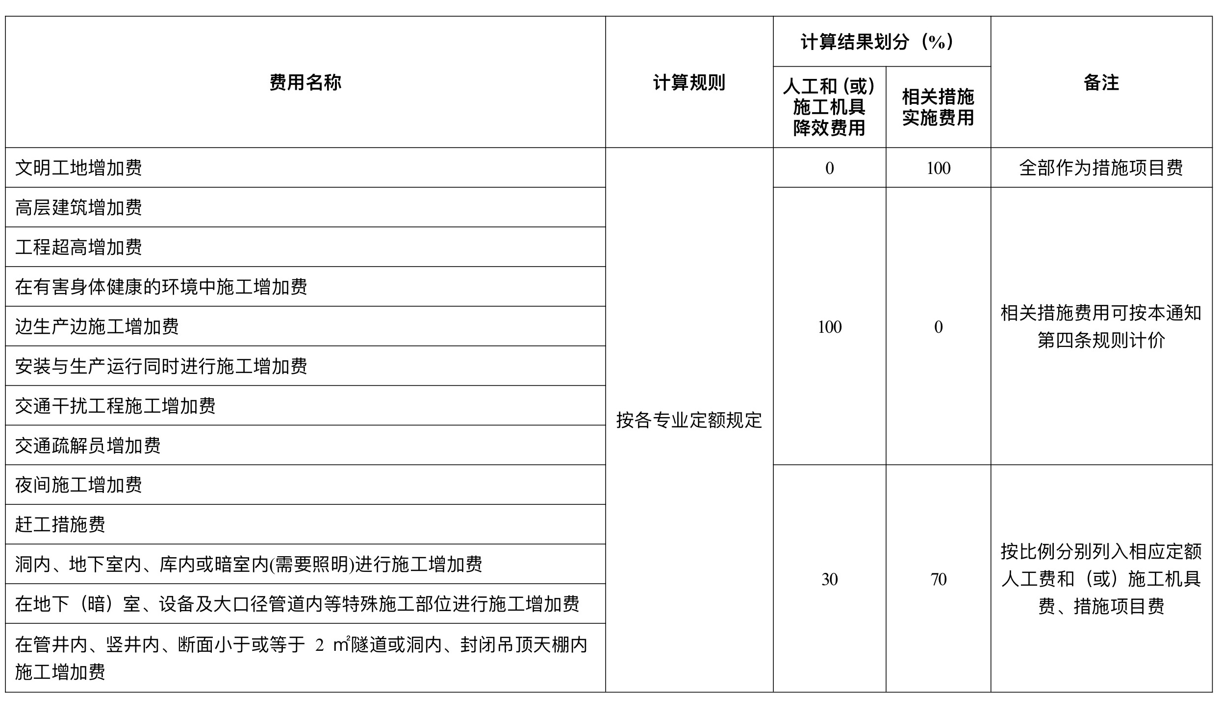 定额以费率计价的费用,主要用于人工和(或)施工机具降效费用、相关措施实施费用,相关比例划分如下表,并按以下规定执行: